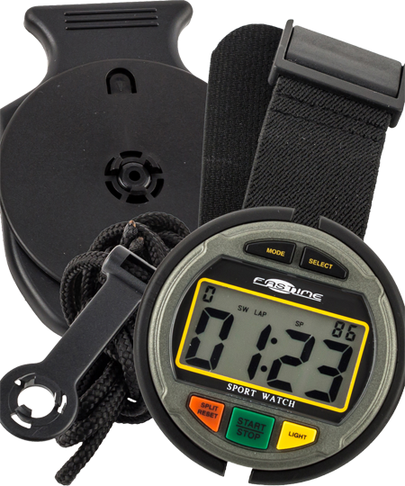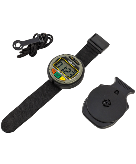 Extra large minutes and seconds digits, smaller hour and 1/100th second digits. Splash resistant. Includes a wrist strap, lanyard and clip option.
